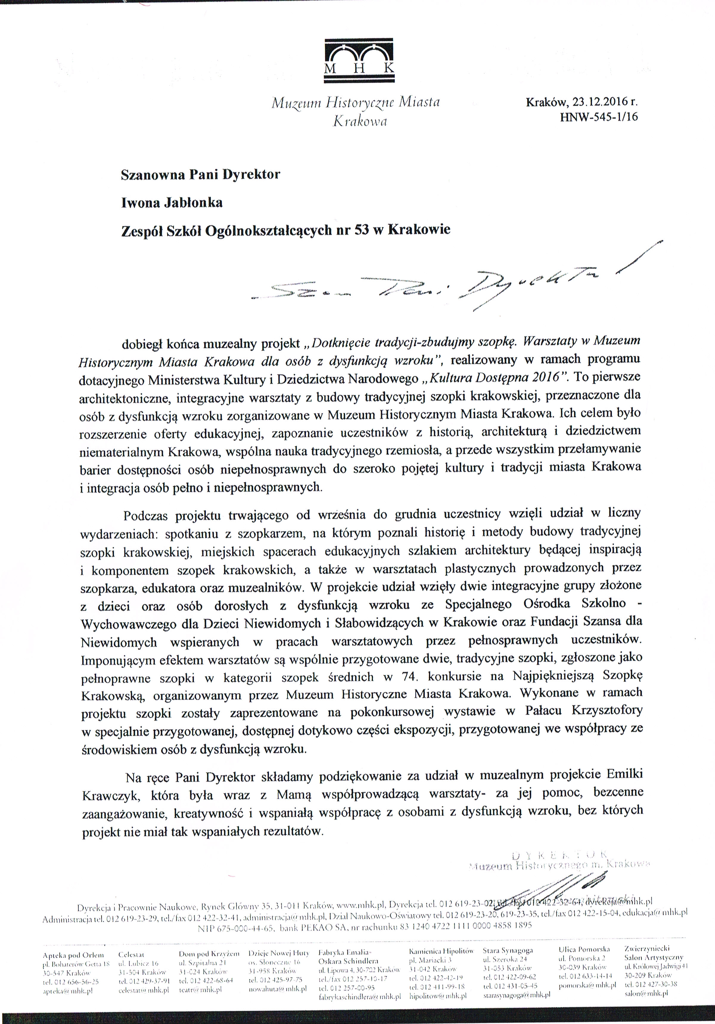 74. Konkurs Szopek Krakowskich Z radością informujemy, że uczennica naszej szkoły, Emilia Krawczyk z kl. V, została laureatką 74. Konkursu Szopek Krakowskich. W rodzinie Państwa Krawczyków od trzech pokoleń panuje tradycja konstruowania szopek bożonarodzeniowych. Kolejnym powodem do dumy jest uczestnictwo oraz wolontaryjna pomoc Emilki w warsztatach z budowy tradycyjnej szopki krakowskiej, których celem jest zintegrowanie osób pełno- i niepełnosprawnych. Piątoklasistka oraz jej Mama współprowadziły wspomniane zajęcia. Aktywność naszej uczennicy została zauważona przez dyrektora Muzeum Historycznego w Krakowie, który docenił Emilkę „za jej pomoc, bezcenne zaangażowanie, kreatywność i wspaniałą współpracę z osobami z dysfunkcją wzroku, bez których projekt nie miał tak wspaniałych rezultatów”. Serdecznie gratulujemy Emilce i jej Mamie oraz życzymy dalszych sukcesów i wielu nagród. Następne Poprzednie